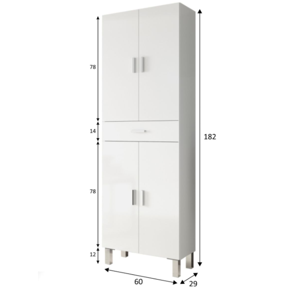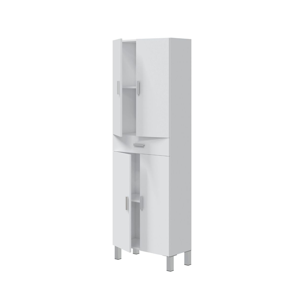 Columna de baño con cuatro puertas, dos estantes en su interior regulables en altura y un cajón. Disponible en blanco brillo.