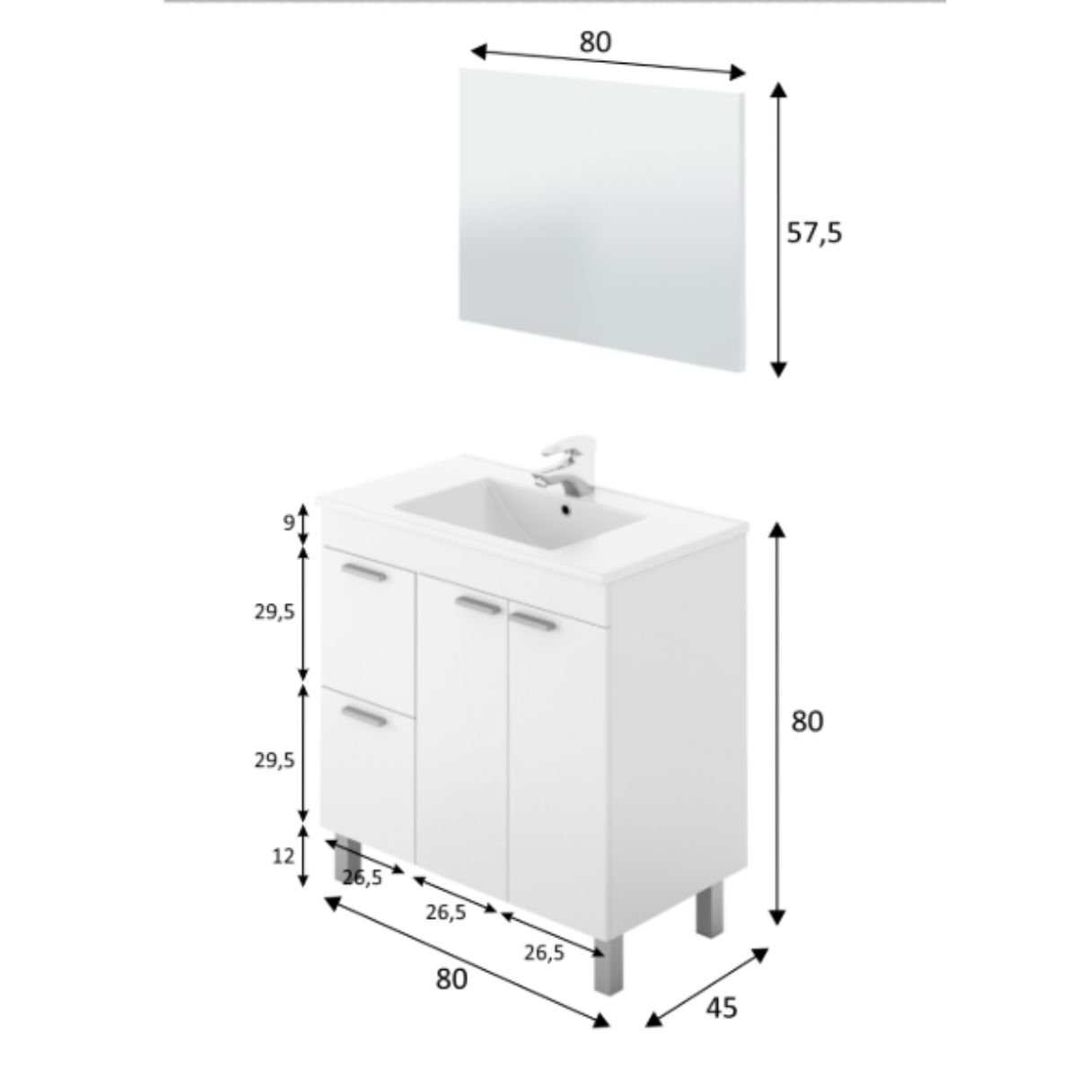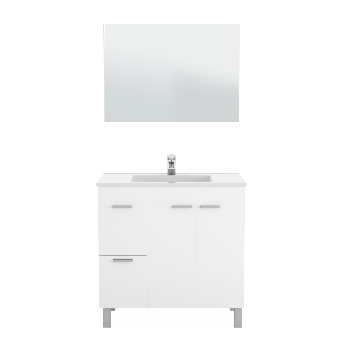 Mueble para lavabo de dos puertas y dos cajones con espejo. Disponible en blanco brillo. Lavabo no incluido.