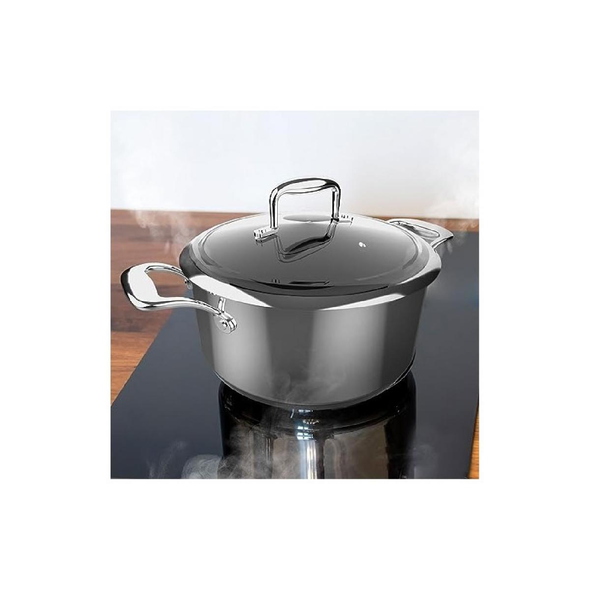 Olla 28 cm de acero inoxidable de alta calidad, con asas remachadas y tapa de cristal templado. Cuenta con un total de 5 capas. Un revestimiento antiadherente de doble capa, 100% libre de PFOA y un fondo difusor de caalor Full Induction, apta par horno hasta 230ºC, apta para lavar en llavavajillas y para todo tipo de cocinas incluida inducción. Fondo indeformable de 5,2mm de espesor.