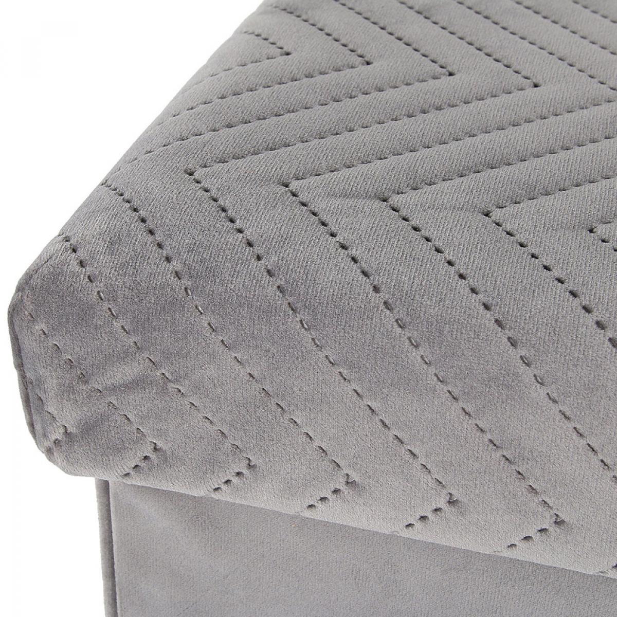 BANCO-PUF PLEGABLE GRIS ZIG-ZA Déjate seducir por este banco-puf de terciopelo con decoración de zig-zag en la tapa. Es plegable y tiene doble función: para sentarse y para almacenar y guardar libros, mantas, juguetes, etc. Resistencia a la sentada de 110 kg Medidas: 76x38 cm; h.38 cm