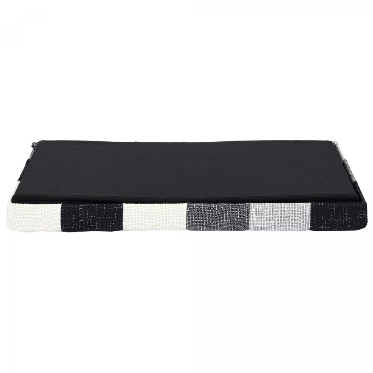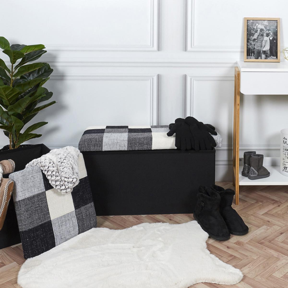 BANCO-PUF PLEGABLE PATCHWORK Con tapa estampada en cuadros grises de distintos tonos de poliéster. Ideal para guardar cosas. Soporta un peso de 110 kg Medidas: 76x38 cm; h.38 cm