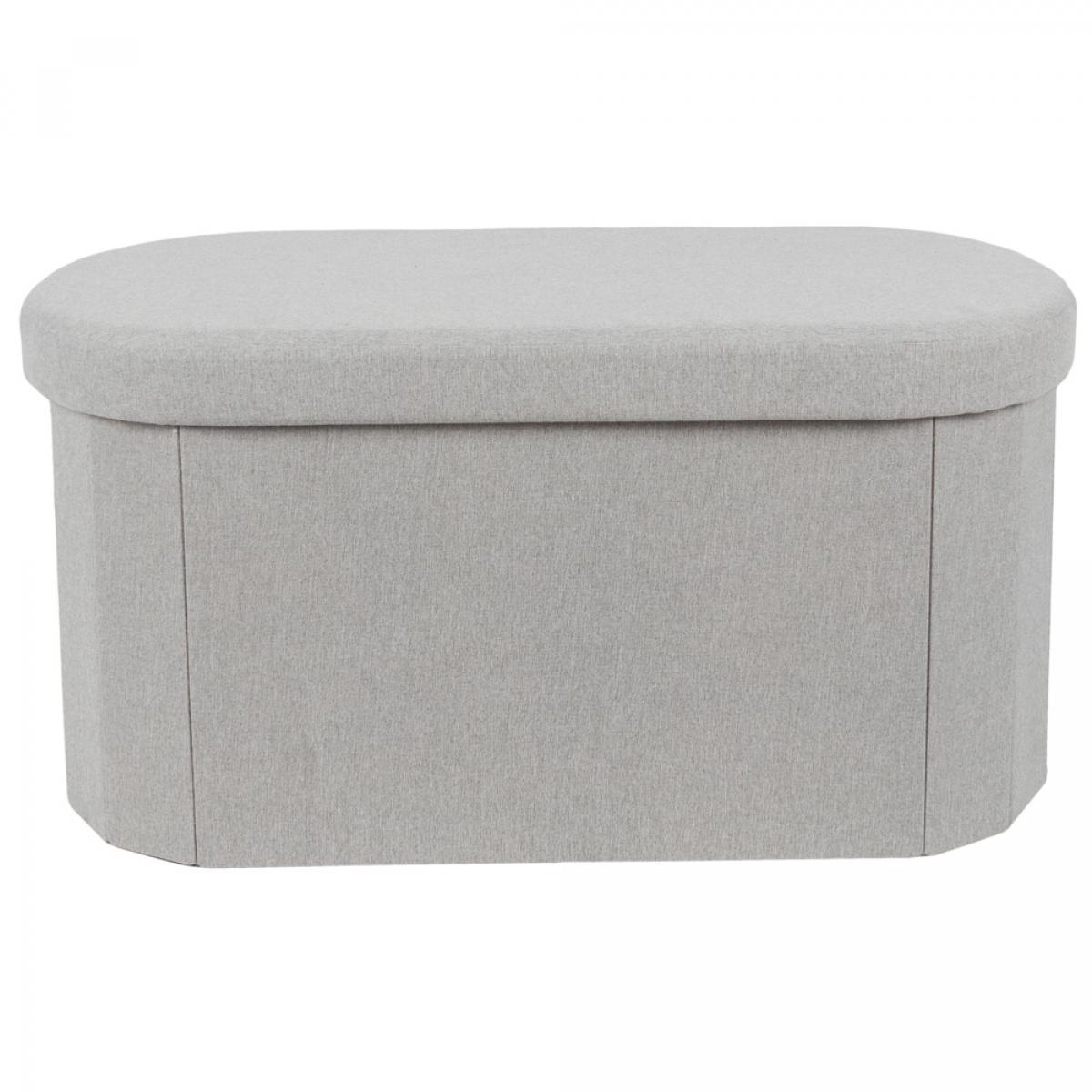 BANCO-PUF PLEGABLE GRIS OVAL Cómodo asiento con generoso espacio de almacenaje. Encaja perfectamente en cualquier estilo de decoración. Se puede guardar fácilmente cuando no se use, es plegable. Soporta un peso máximo de 110 kg Estructura de madera MDF y tapizado de poliéster, relleno de PU. Medidas: 76x38 cm; h.38 cm