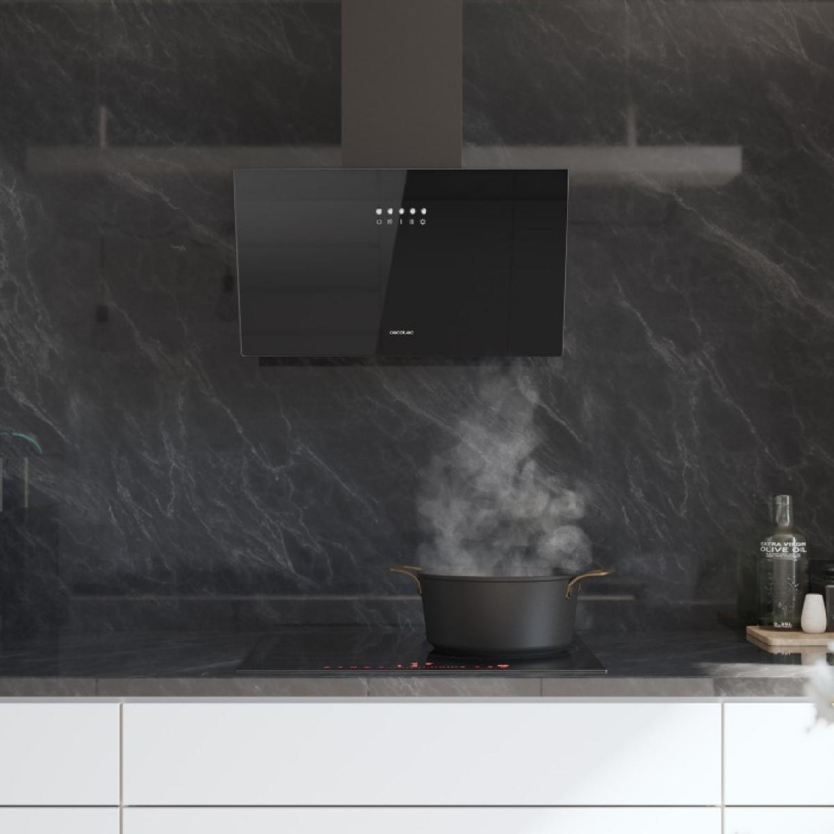 Campana decorativa Bolero Flux DM 603500 Glass Black B de 60cm de ancho, acabado frontal vidrio negro, succión 350m3/h, Motor 65W, Clase B, control mecánico, 3 niveles de potencia, luz y filtro de carbono.
