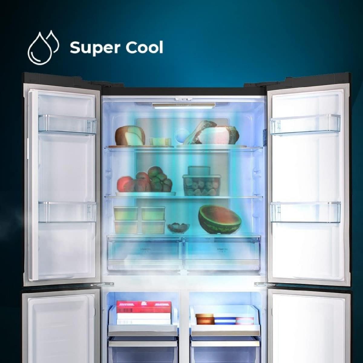 Frigorífico 4 puertas inox con una gran capacidad de 490 L, 183 cm de alto, 91 cm de ancho, clase energética E y compresor Inverter Plus. Además, cuenta con distintos modos como Fast Cooling y Fast Freezing, así como sistemas como MultiAirFlow, Total NoFrost, Metal Cooling y Modo Vacaciones.