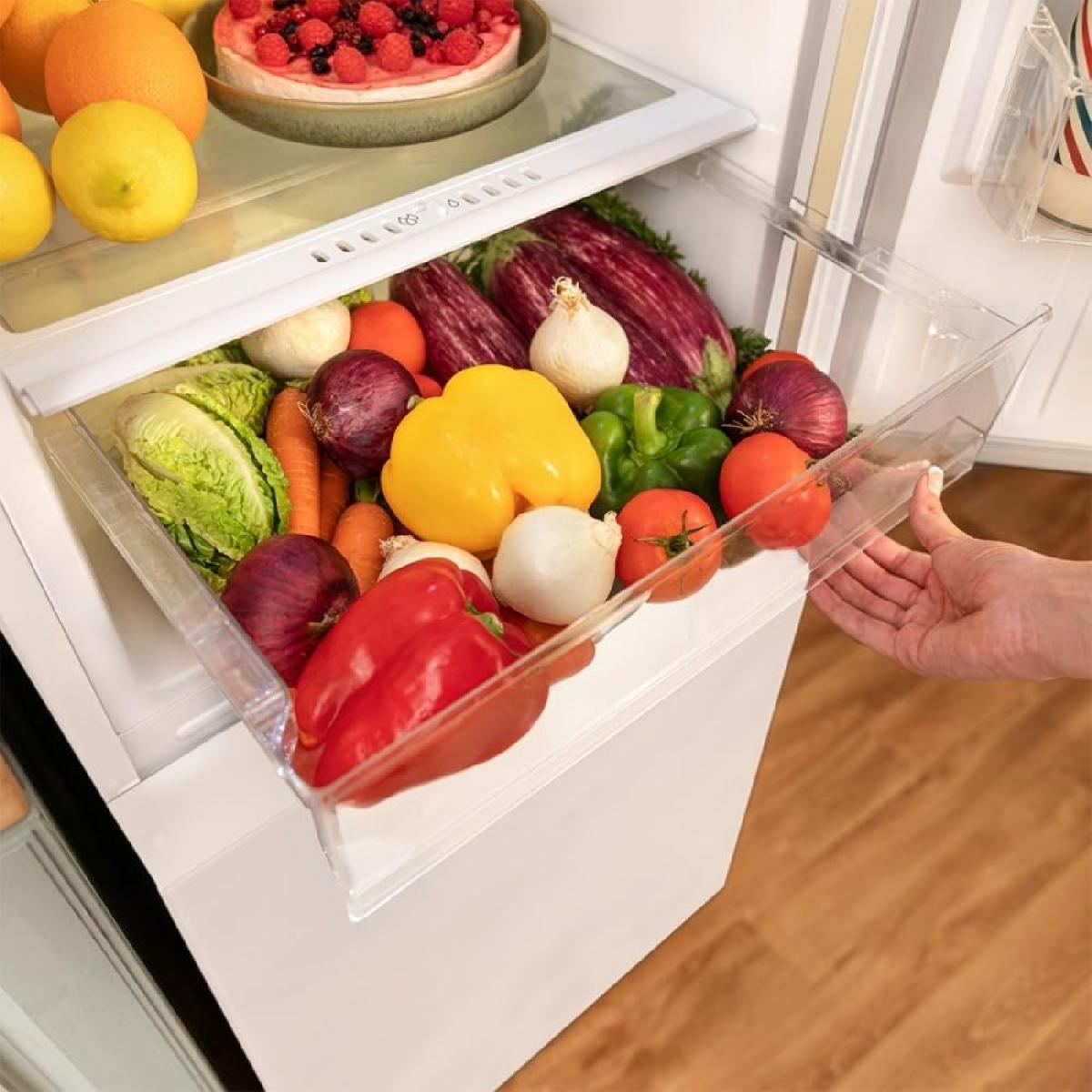 Frigorífico combi cristal blanco, 180cm de alto y 55 cm de ancho, con 250 litros de capacidad, compresor Inverter Plus, Total No Frost, dispensador de agua, clase energética D y con sistema Multi Air Flow. Además, cuenta con el modo Fast Cooling y cajón Humidity Box con regulación de humedad así como alarmas de puerta abierta y fallo de funcionamiento.