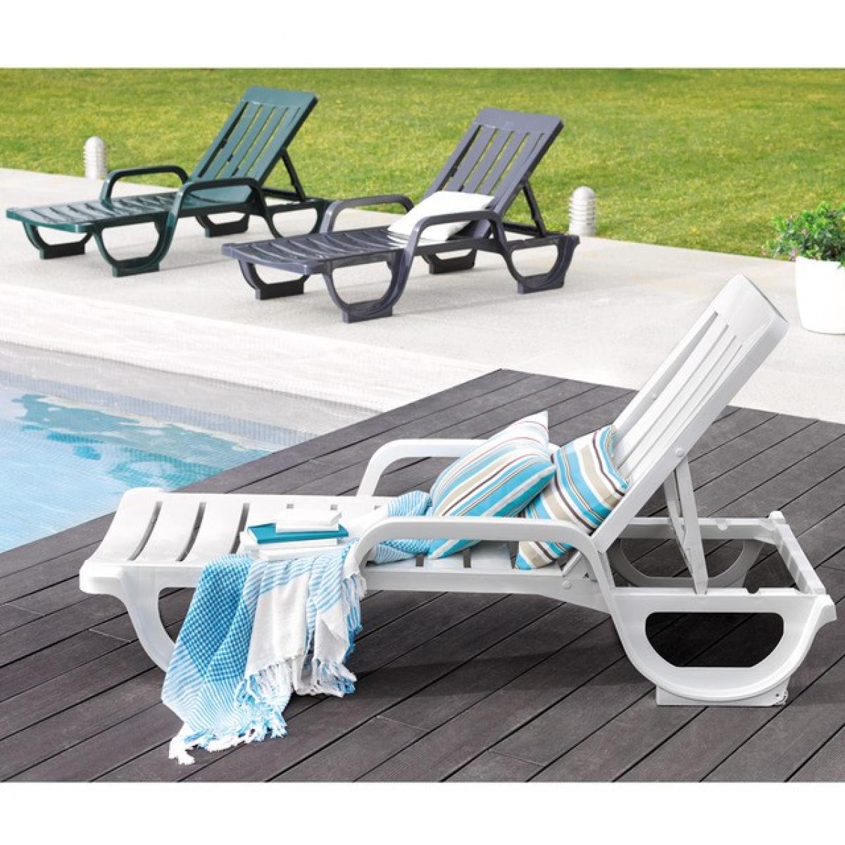 -Tumbona con reposabrazos, estructura de polipropileno de color blanco, muy resistente, 5 posiciones, apilable.