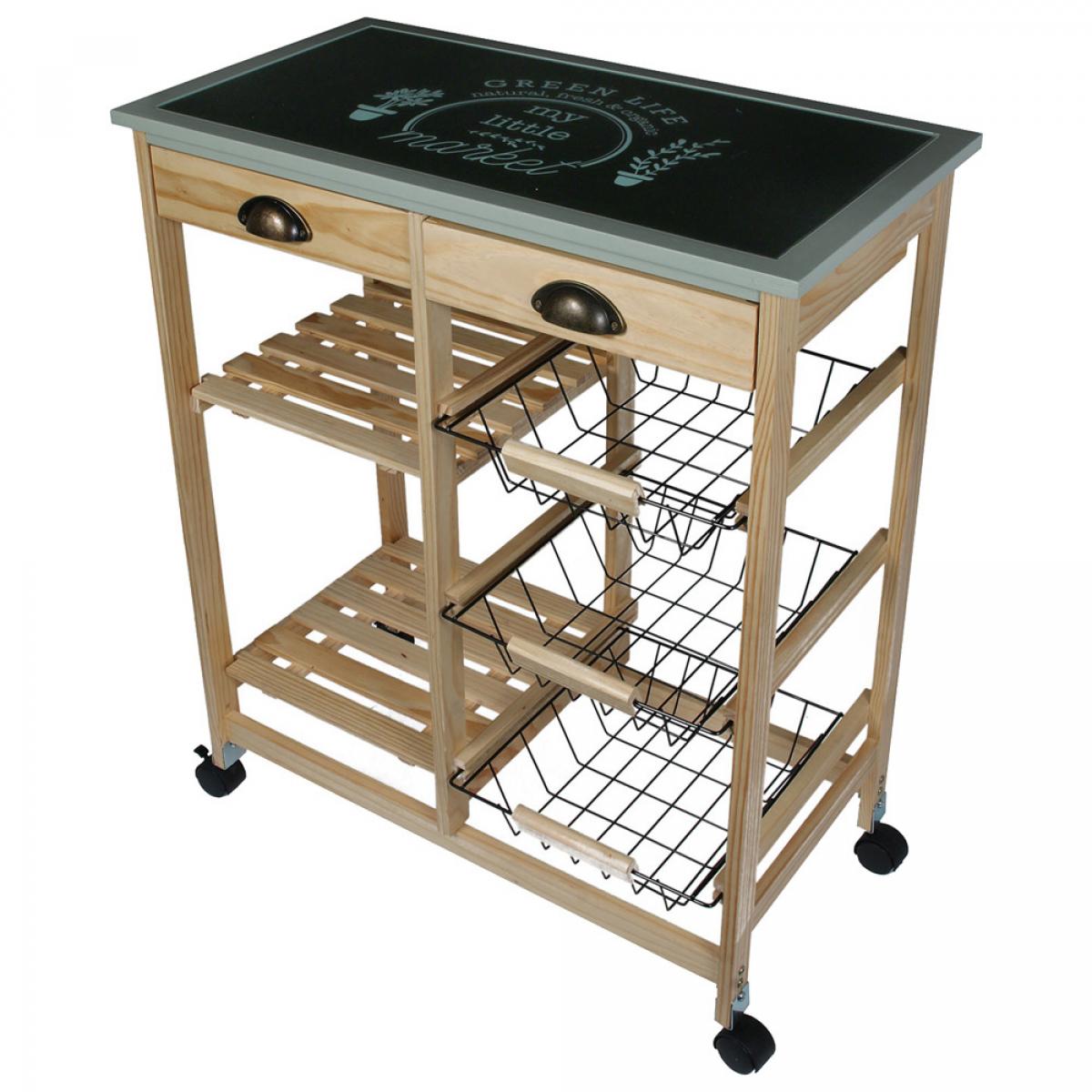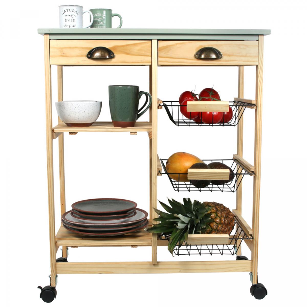 MESA CAMARERA COCINA C/RUEDAS Organiza tu espacio en la cocina con esta mesa con ruedas de 2 cajones, 3 cestas de metal, 2 baldas y bandeja superior de vidrio. Medidas: 66x35 cm; h.81 cm