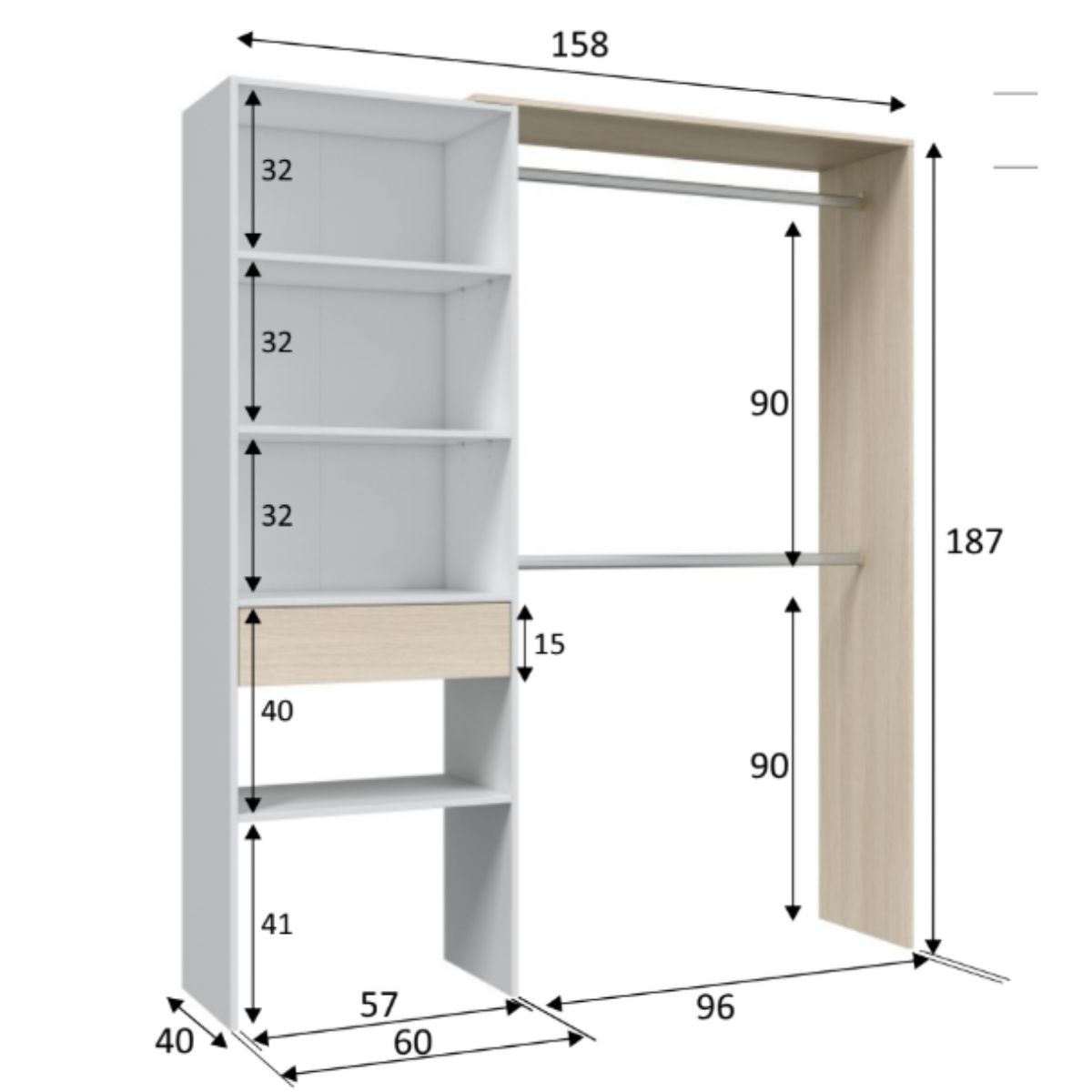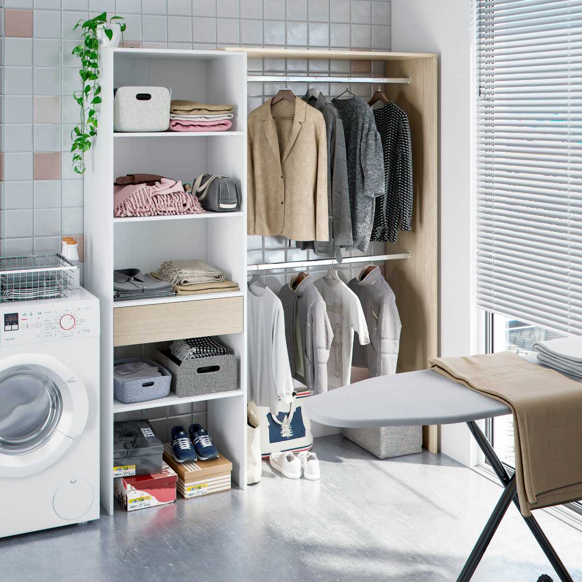 Armario vestidor con estantes, un cajón y dos barras de colgar. Posibilidad de montar la estantería a la derecha o izquierda. Disponible en color blanco combinado con roble.