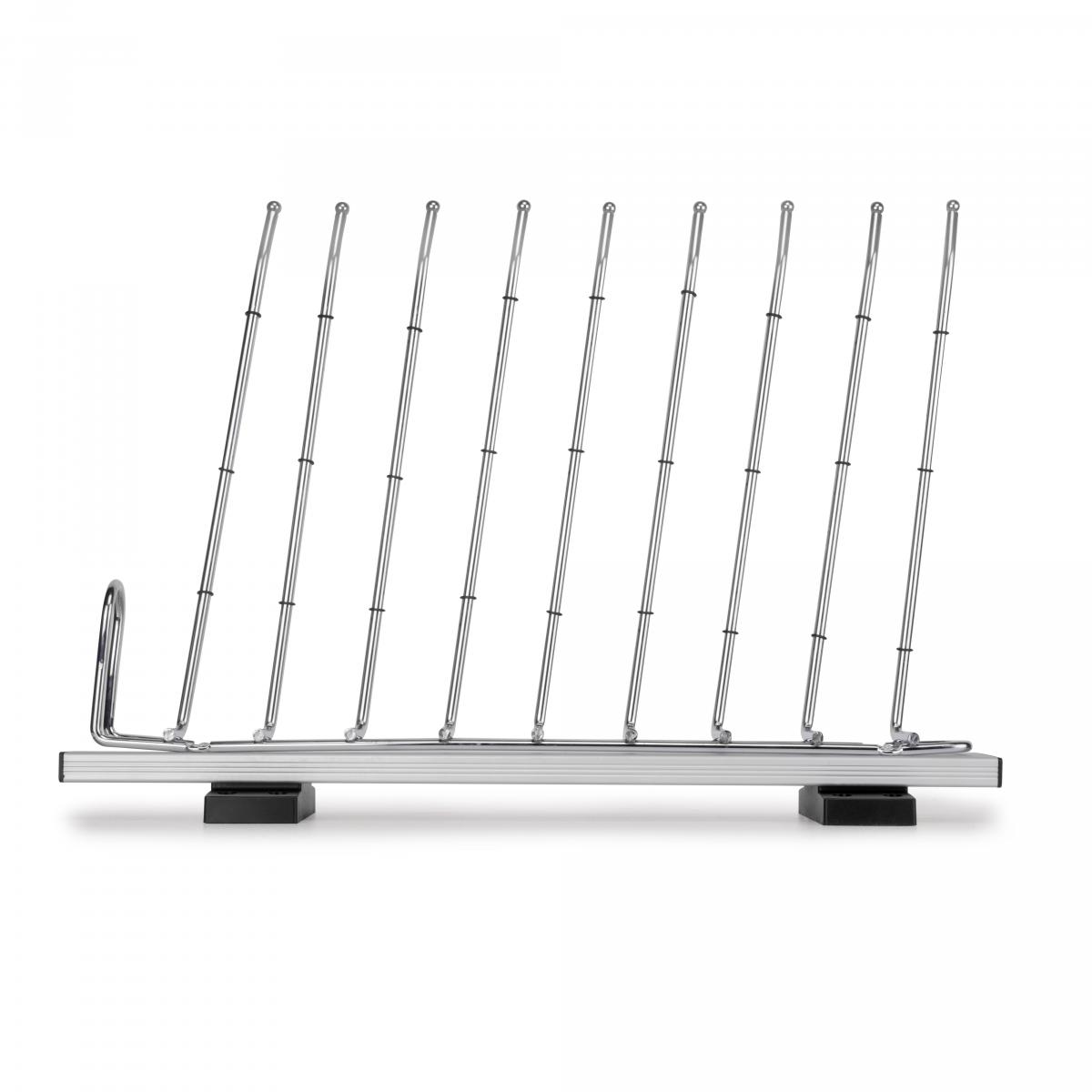 Montaje sencillo en el lateral cuya extracción es mediante guías de bolas para su deslizamiento. Dispone de 9 varillas que incluyen gomas antideslizantes para facilitar que las prendas no resbalen. Además dispone de un tirador frontal para facilitar su extracción. Está fabricado en aluminio con varilla de acero cromado y los soportes en plástico negro.