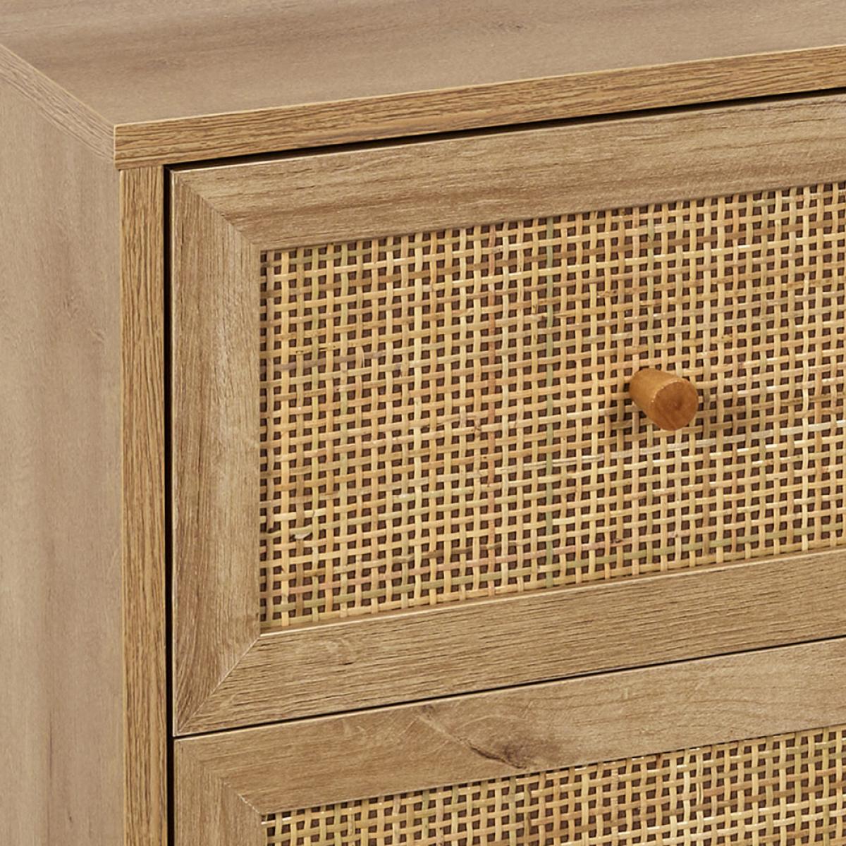 CÓMODA 3 CAJONES BALI Moderniza la decoración de tu hogar aportando una de exotismo balinés. De madera (panel de partículas y MDF) y ratán. Medidas: 90x39 cm; h.79 cm