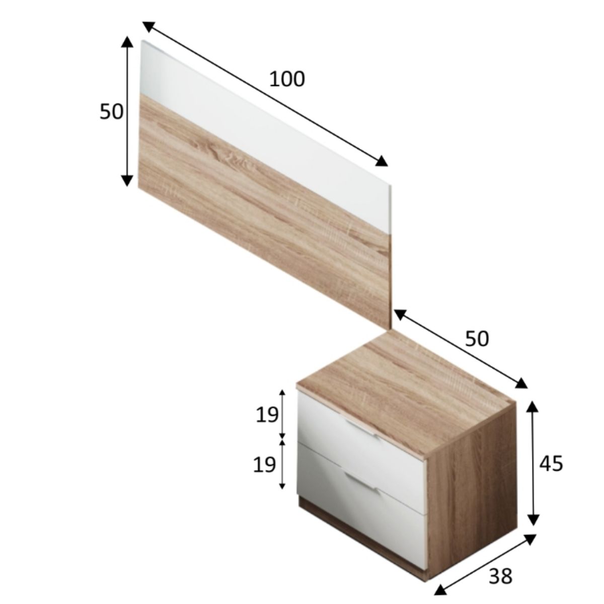 Cabezal para camas de 90 cm y una mesita con dos cajones. Disponible en color roble canadian combinado con blanco artik.