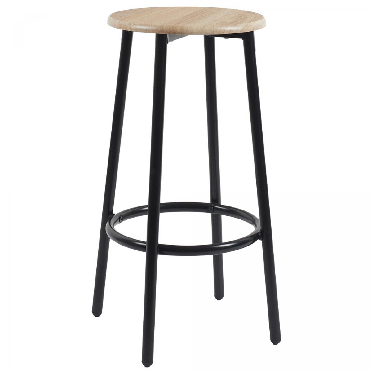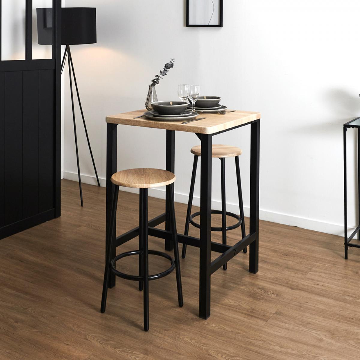 JGO. MESA C/2 TABURETESS LOKA Conjunto de mesa alta con dos taburetes de estilo industrial de la série Loka. Estructura y patas de hierro. Tablero de MDF. Medidas: Mesa: 60x60 cm; h.86 cm Taburetes: d.30 cm; h.62 cm Medidas del packaging: 91x62 cm; h.18 cm