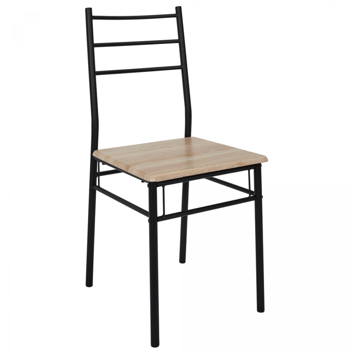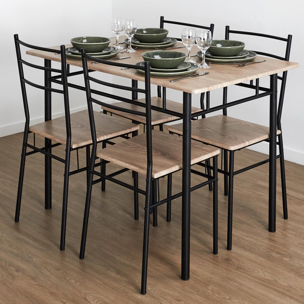 JGO. MESA C/4 SILLAS LOKA Conjunto de mesa de comedor con cuatro sillas de estilo industrial de la série Loka. Una solución cómoda para espacios pequeños. Estructura y patas de hierro. Tablero y asiento de MDF. Medidas: Sillas: 37x46 cm; h.80 cm; altura del asiento: 44 cm Mesa: 110x70 cm; h.76 cm