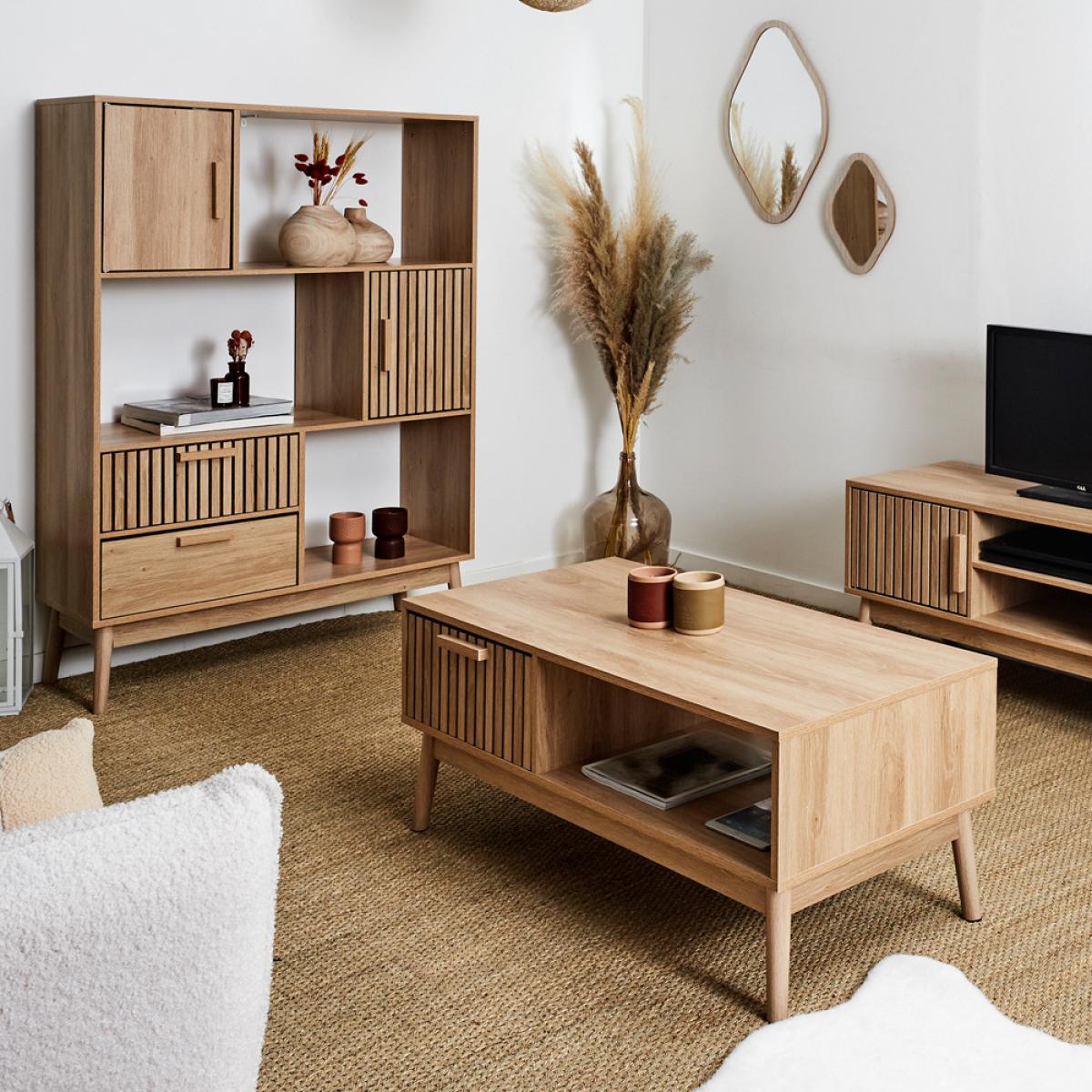 LIBRERÍA C/CAJONES KLAUS Viste con estilo tu salón o dormitorio con la libería Klaus. Realza la presentación de libros y objetos decorativos. De madera, con acabado crudo y natural. Con dos compartimentos con puerta y dos cajones. Combínala con otros muebles Klaus. Medidas: 100x35 cm; h.140 cm