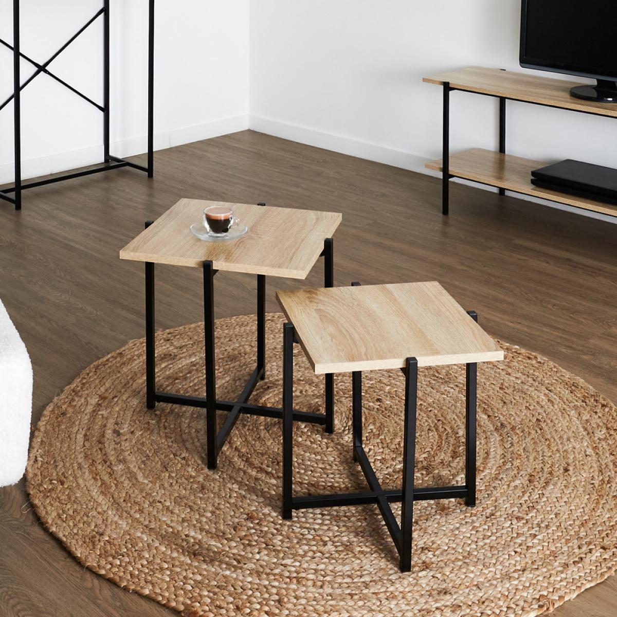 JGO. 2 MESAS NIDO LOKA Elegante conjunto de dos mesas de la série Loka, de aspecto industrial. Estructura de hierro y tableros de MDF. Medidas: Mesa grande: 40x40 cm; h.40 cm Mesa pequeña: 35x35 cm; h.35 cm