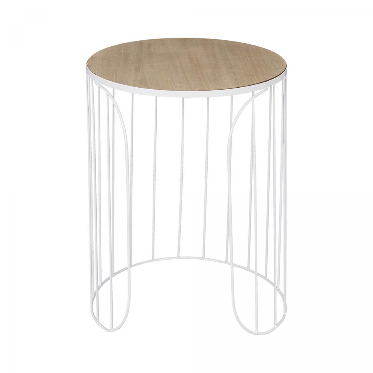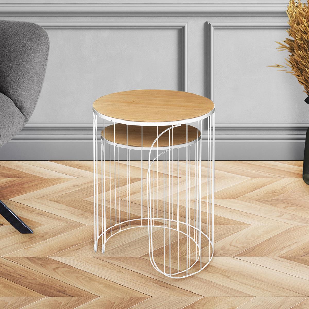JGO. 2 MESAS NIDO VARILLA BLAN ¡Estas mesas nido vestirán tus salones con gran elegancia! Con estructura de varilla de metal y tabla de MDF. Encajables. Medidas: Mesa grande: d.40 cm; h.50 cm Mesa pequeña: d.35 cm; h.40 cm