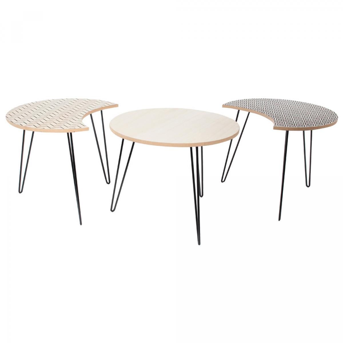 JGO. 3 MESAS AUXILIARES PUZZLE Conjunto de tres mesas auxiliares de madera con patas de metal: Mesa circular de madera lisa, mesa medialuna con estampado negro de rombos y mesa medialuna con estampado negro zig-zag. Se pueden encajar entre ellas para crear conjuntos armónicos según las necesidades. Medidas: Mesa redonda: d.45 cm; h.36 cm Mesa medialuna: 45x38 cm; h.36 cm