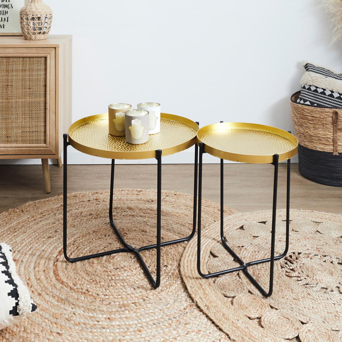 MESA AUXILIAR DE METAL D.50 CM Cambia la decoración y moderniza tu espacio con esta mesa auxiliar de hierro con bandeja dorada y patas negras. Plegable. Perfecta para espacios reducidos. Combina funcionalidad y estética moderna. Bandeja de acabado martilleado. Medidas: d.50 cm; h.45 cm