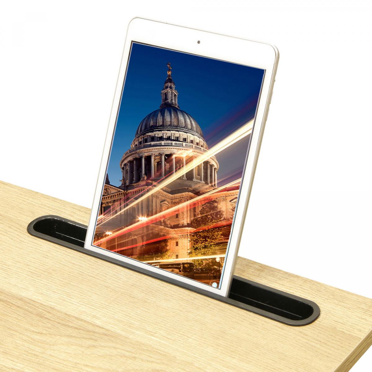 MESA C/SOPORTE TABLET Mesa auxiliar Nate con dos ranuras para colocar objetos como una tablet. Ideal como mesa auxiliar en camas o sofás, ya que sus patas en un lado permiten acoplarse a otros muebles. Medidas: 48x28 cm; h.62,5 cm