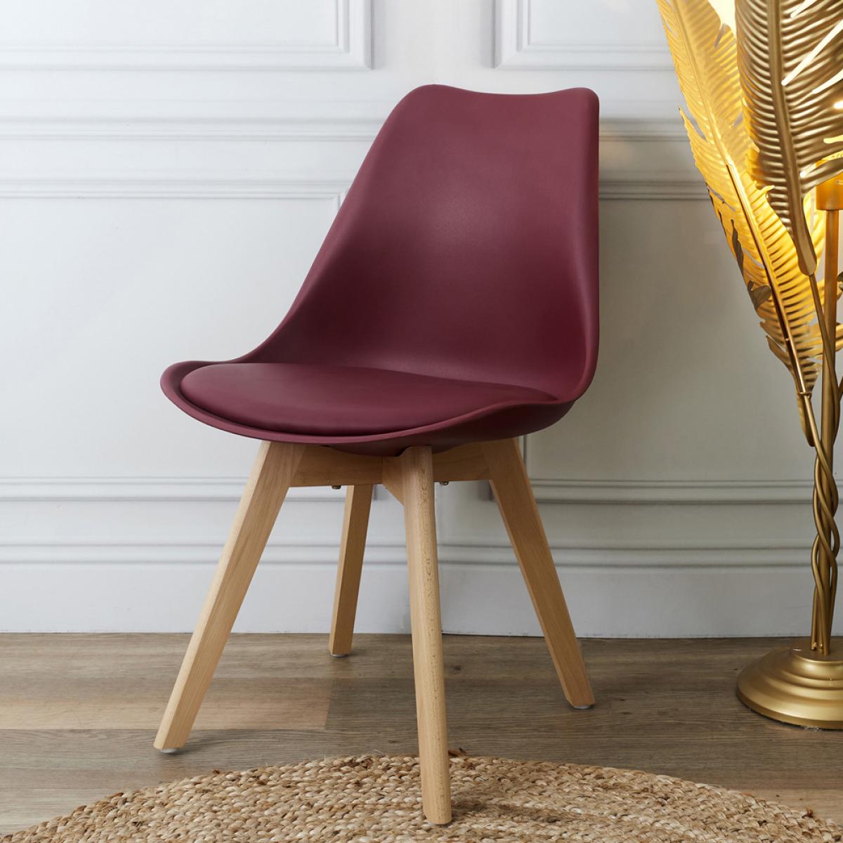 SET 2 SILLAS ACOLCHADA BURDEOS De diseño escandinavo tipo Beech Tulipa de Charles Eames. Ideal para dar un aire de modernidad a sus interiores. Muy cómoda y confortable. Patas de madera de haya y asiento acolchado. Soporta un peso máximo de 110 kg Medidas: 48,5x57 cm; h.83,5 cm. Altura del asiento: 41,5 cm