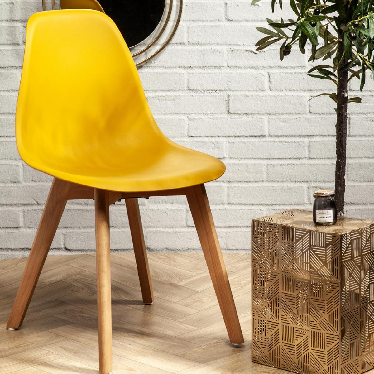 SET 2 SILLAS ESCANDINAVAS MOSTAZA SET 2 SILLAS STOCKHOLM. De diseño escandinavo tipo Beech Tulipa de Charles Eames. Déjese seducir su diseño depurado y a la moda. Patas de madera y asiento de plástico. Soporta un peso máximo de 110 kg Medidas: 46x46 cm; h.82,5 cm. Altura del asiento: 41,5 cm