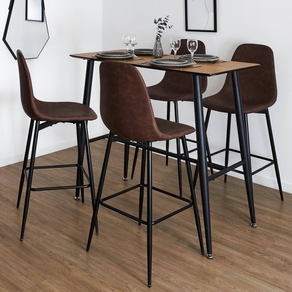 SET 2 TABURETES BAR MARRÓN AMBER Descubre esta silla de bar cómoda y elegante, para tu zona de relax o bar. Diseño moderno de linieas limpias que aporta un toque sofisticado a la decoración interior, creando un ambiente agradable y acogedor. Soporta un peso máximo de 110 kg Materiales: respaldo de madera contrachapada, asiento de plástico PU relleno de PU y patas de hierro. Medidas: 46x53,5 cm; h.106 cm; altura del asiento: 70 cm