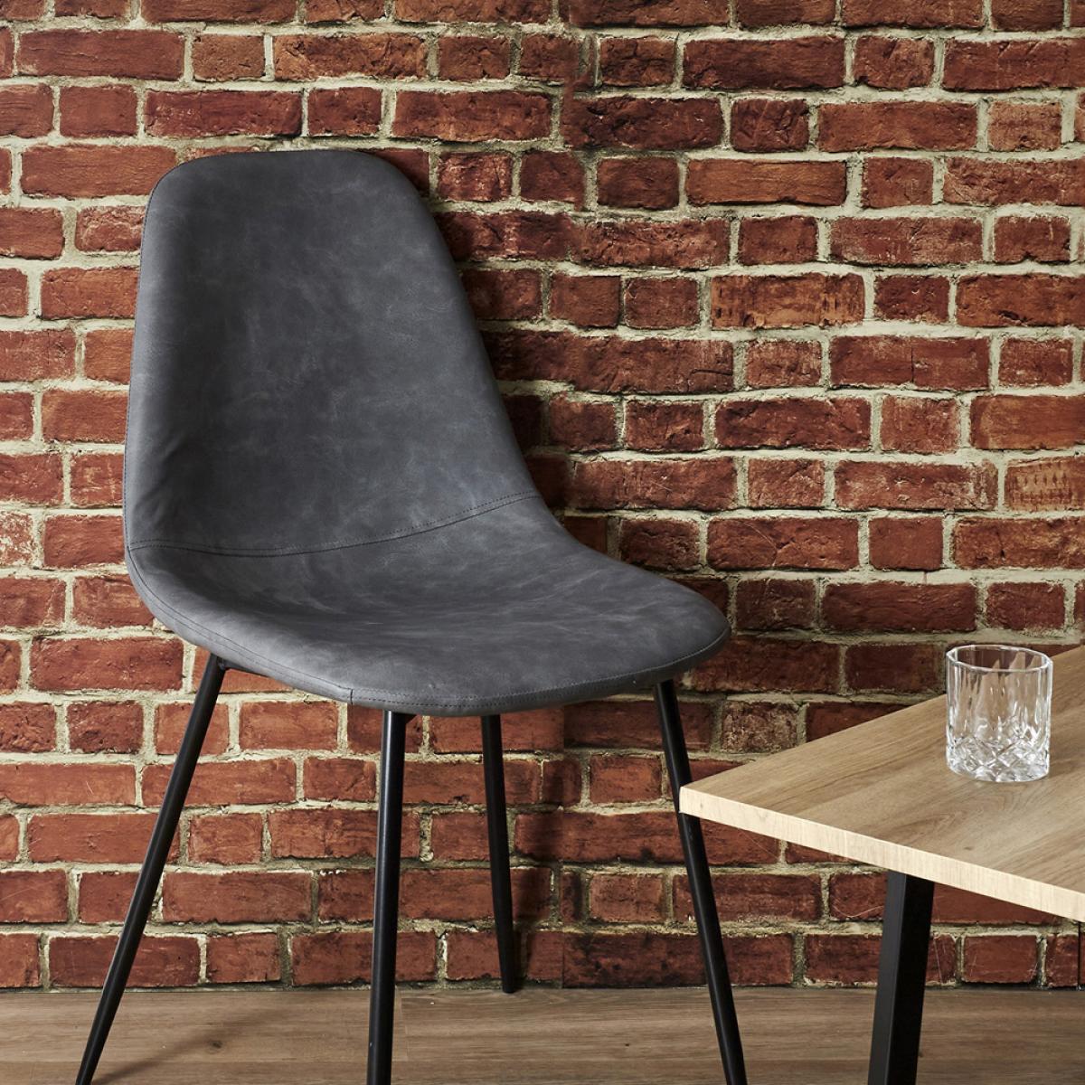 SET 4 SILLAS GRIS AMBER Mejora el espacio de la mesa o la sala de estar con la silla Amber, de aspecto industrial. Elegante y cómoda. Soporta un peso máximo de 110 kg Materiales: respaldo de madera contrachapada, asiento de plástico PU relleno de PU y patas de hierro. Medidas: 54,2x44 cm; h.85 cm