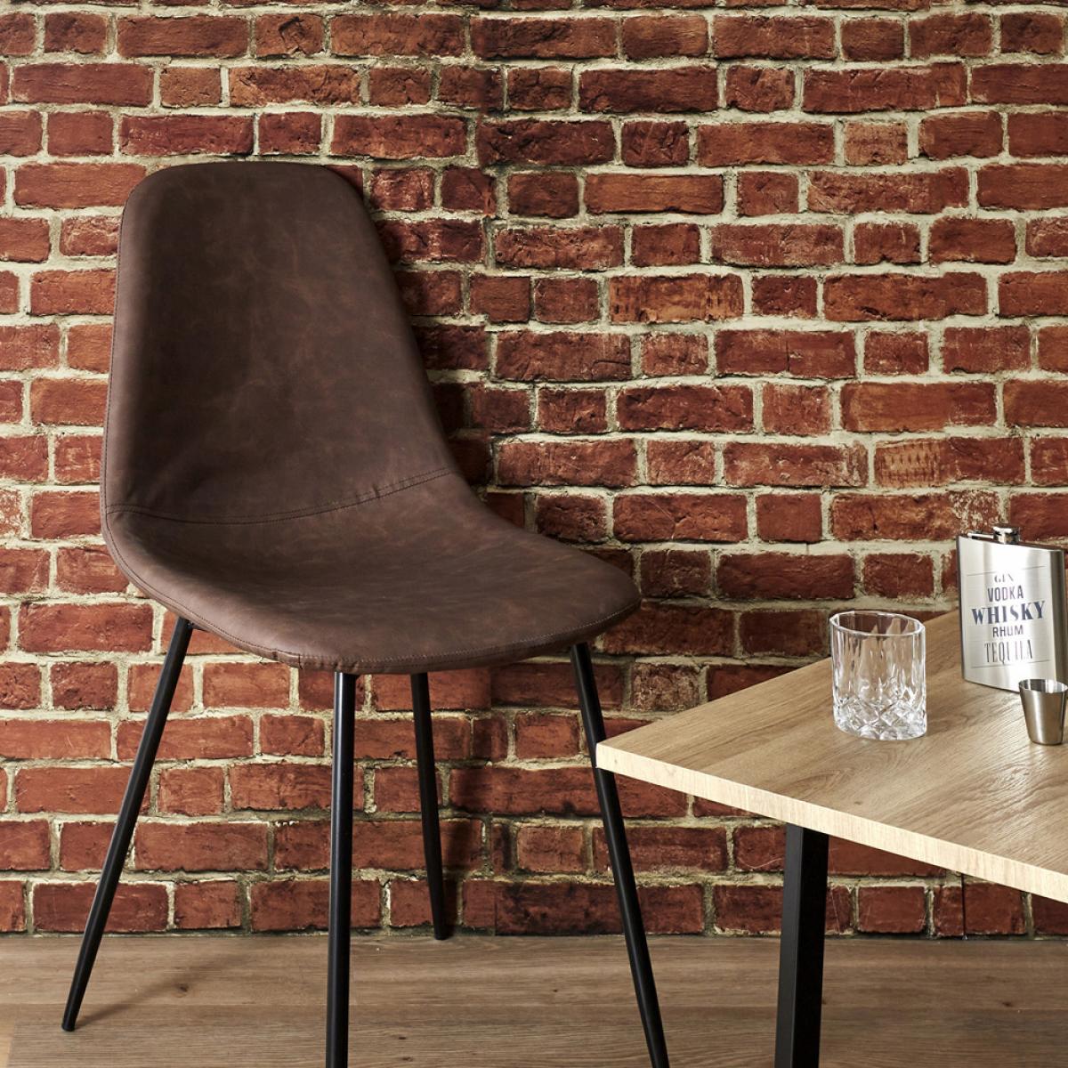 SET 4 SILLAS MARRÓN AMBER Mejora el espacio de la mesa o la sala de estar con la silla Amber, de aspecto industrial. Elegante y cómoda. Soporta un peso máximo de 110 kg Materiales: respaldo de madera contrachapada, asiento de plástico PU relleno de PU y patas de hierro. Medidas: 54,2x44 cm; h.85 cm