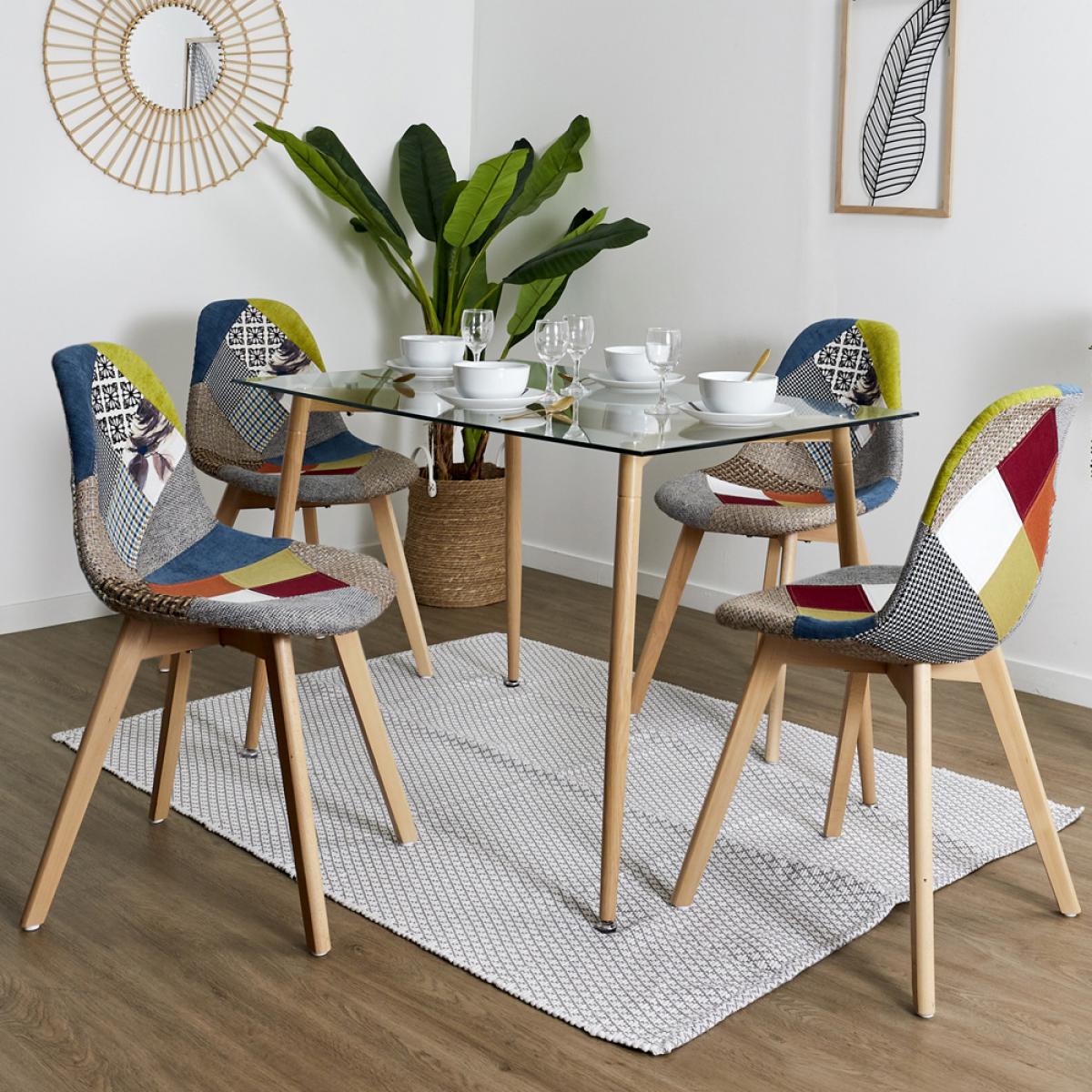 SET 4 SILLASS PATCHWORK 87x54x47 CM De diseño escandinavo tipo Beech Tulipa de Charles Eames. Patas de madera y asiento de tela. Soporta un peso máximo de 110 kg Composición: Patas de madera de haya, tejido de poliéster y relleno de PU. PP. Medidas: 47x54 cm; h.87 cm