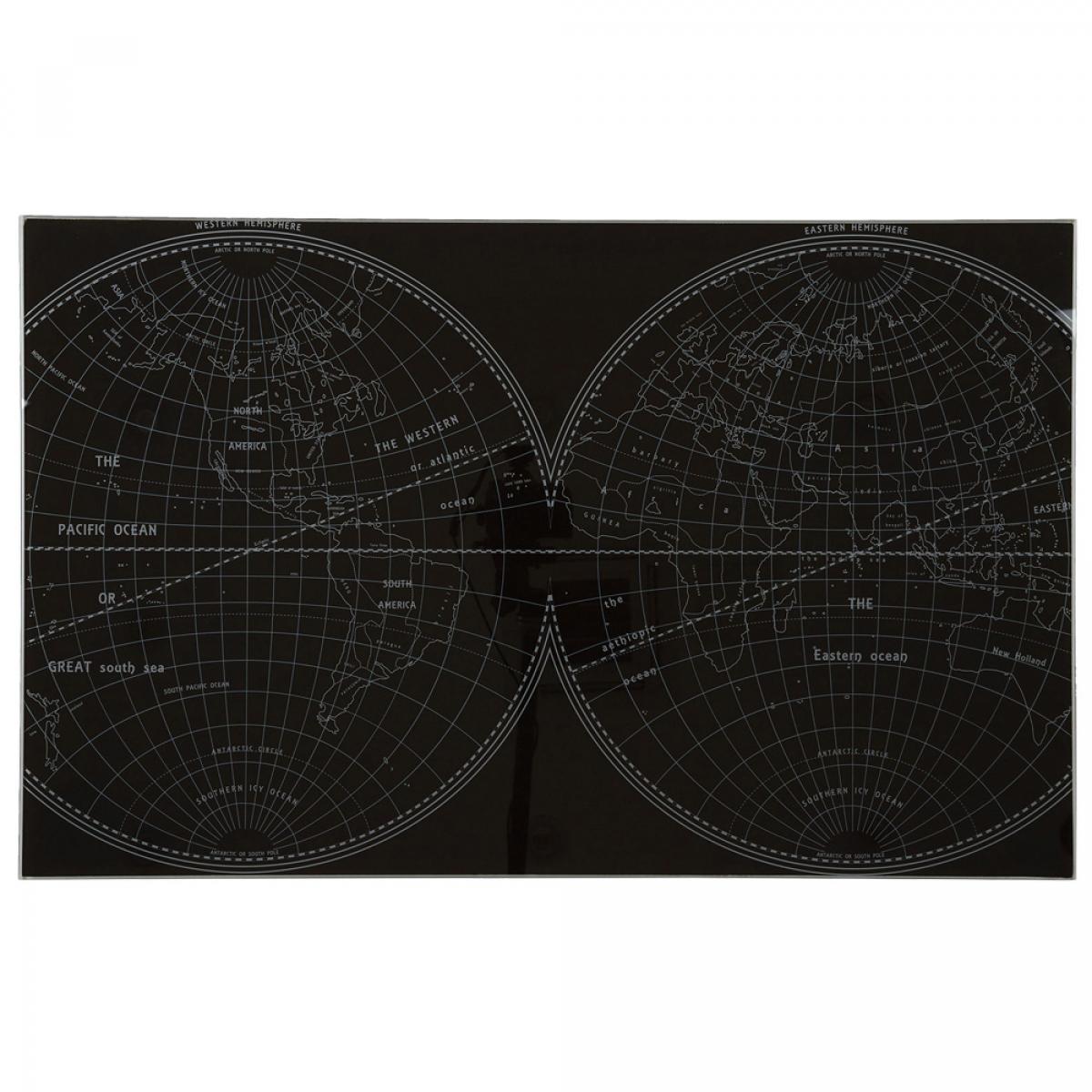 ESCRITORIO MAPAMUNDI NEGRO Original mesa con parte superior de vidrio decorada con un mapamundi. Patas de metal. Medidas: 80x50 cm; h.74 cm
