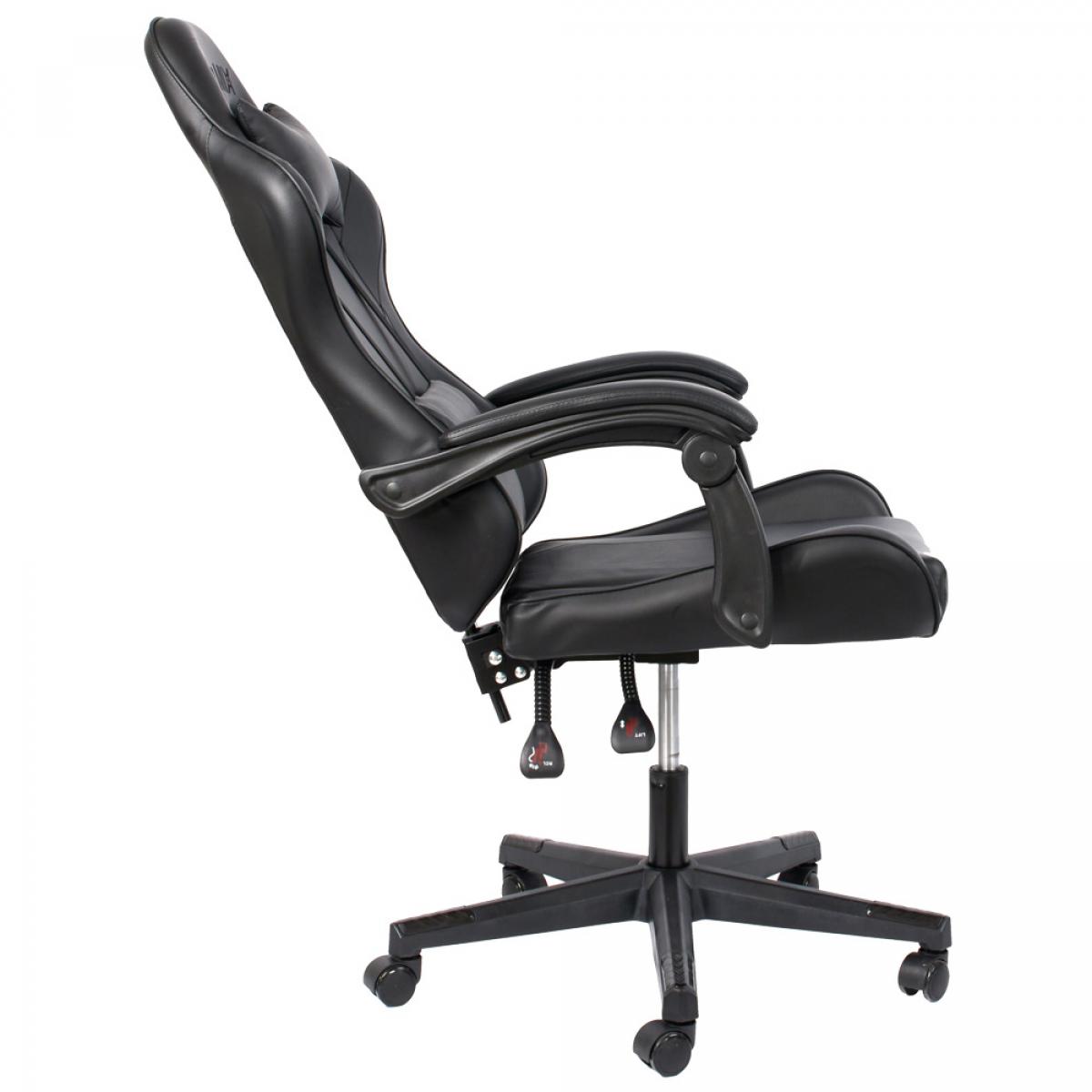 SILLA DESPACHO GAMER A los amantes de los videojuegos les encantará esta silla de gamer, para jugar durante horas con la máxima comodidad. Úsala también como silla de despacho o escritorio. Con ruedas, reposabrazos, apoyacabezas con cojín, altura regulable y asiento reclinable. Medidas: 62x52 cm; h.117-127 cm