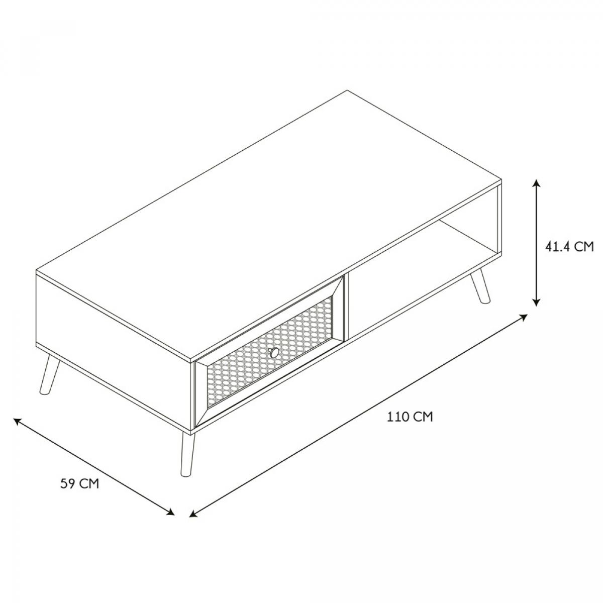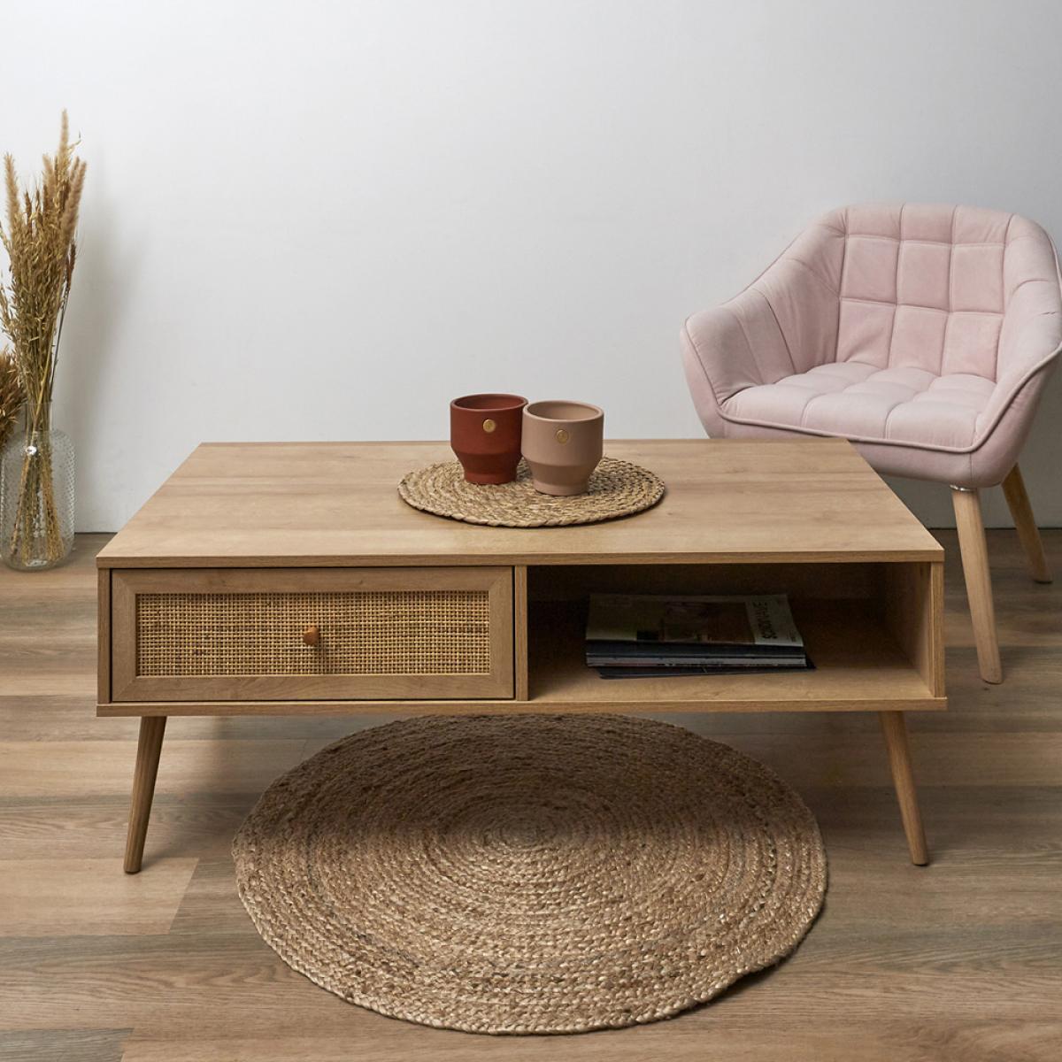 MESA BAJA C/CAJÓN BALI Moderniza la decoración de tu hogar aportando una de exotismo balinés. Ideal como mesa de centro. De madera (panel de partículas y MDF) y ratán. Medidas: 110x59 cm; h.41,4 cm