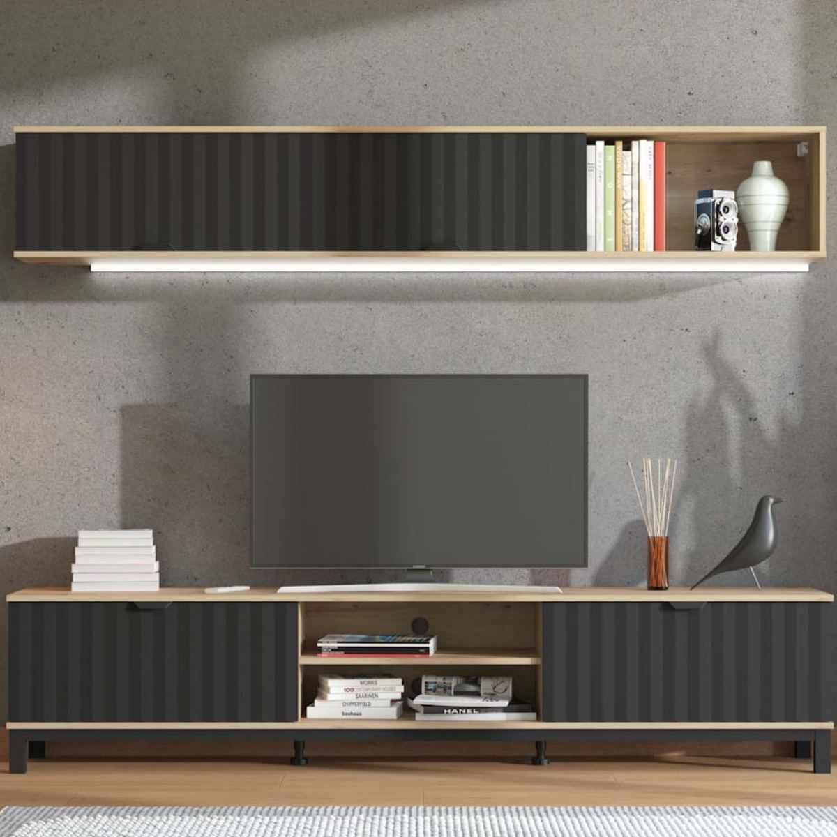 Este mueble de salón se compone de dos módulos esenciales: un mueble de televisión y un módulo de colgar.