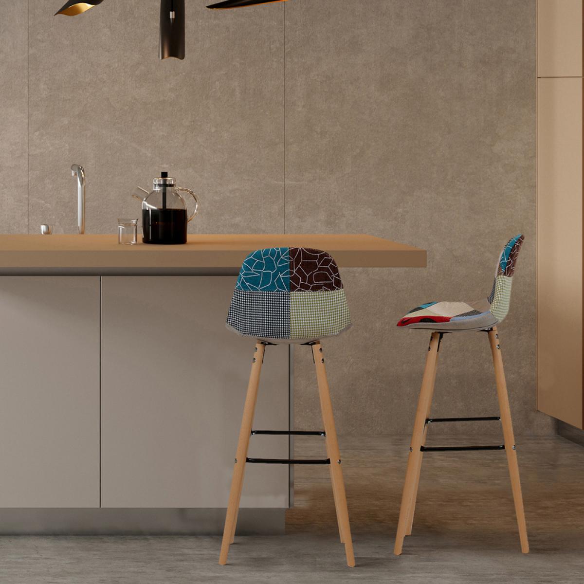 SET 2 TABURETES BAR PATCHWORK Mejora el espacio alrededor de la isla de cocina con este TABURETE de bar. Asiento de tela y patas de madera y metal. Medidas: 39x42 cm; h.92,5 cm