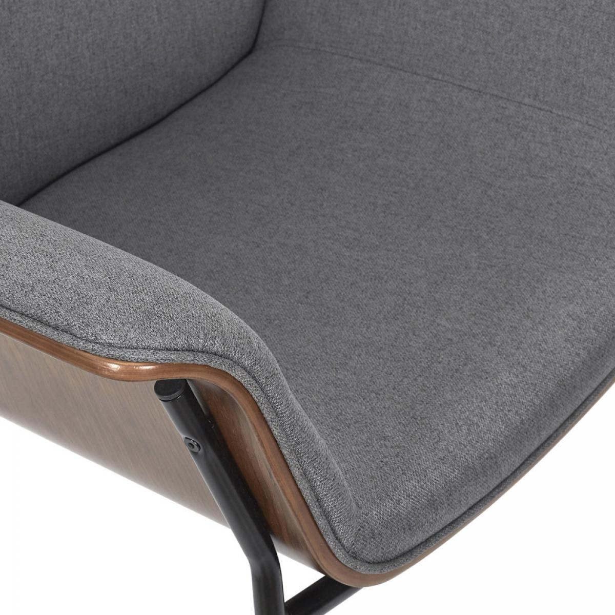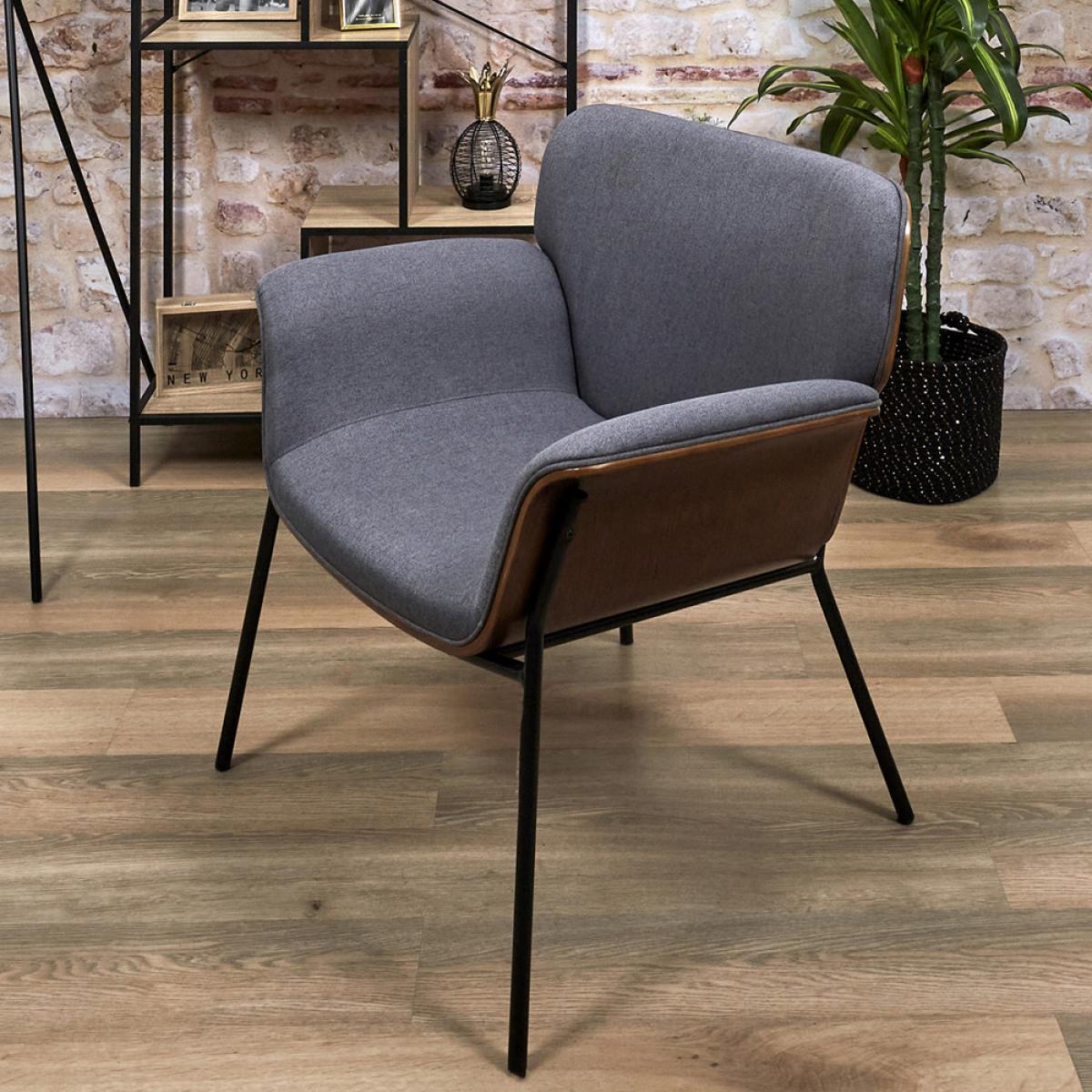BUTACA GRIS SAM Butaca de tela gris con respaldo, bajos de madera y patas de hierro. Medidas: 80x72 cm; h.80 cm