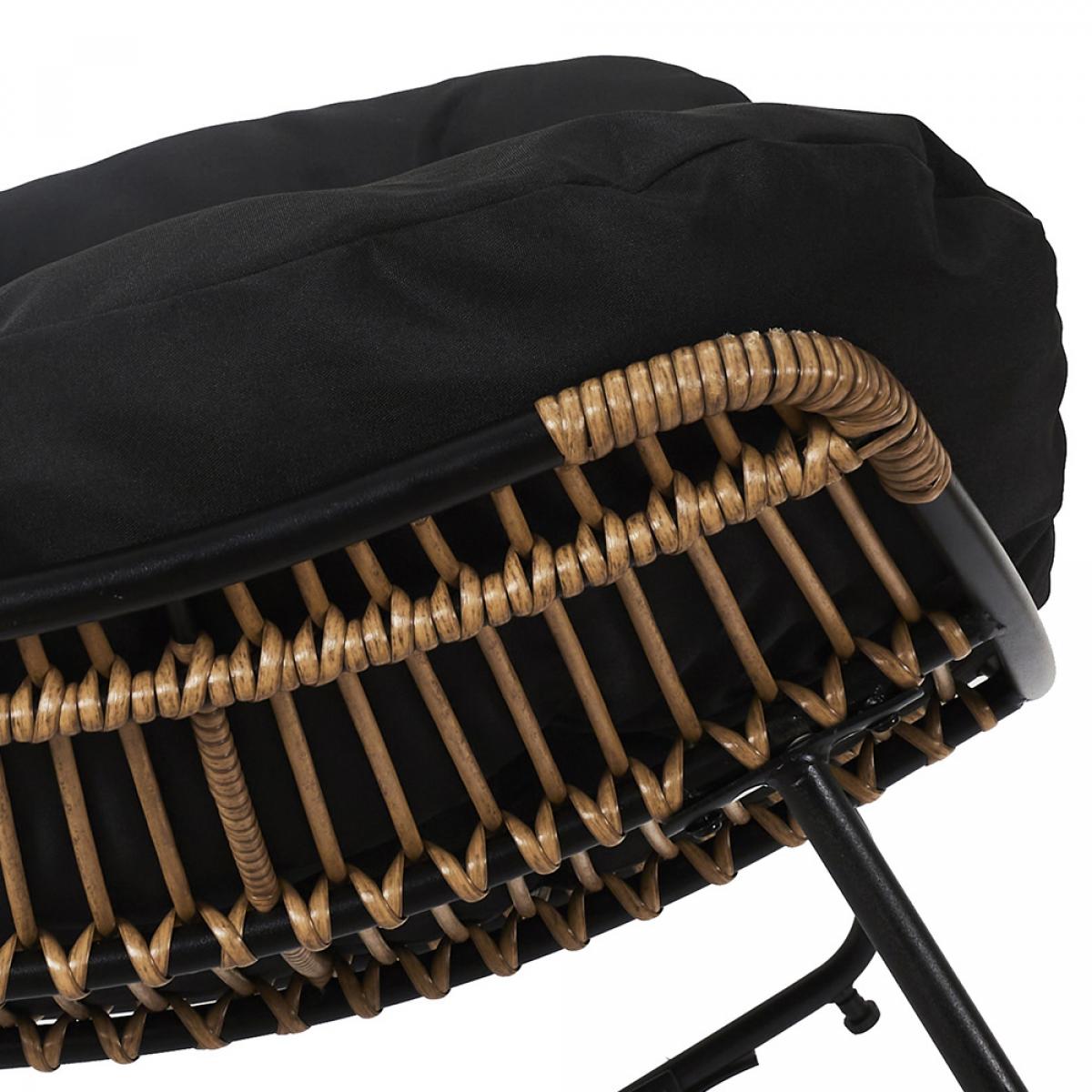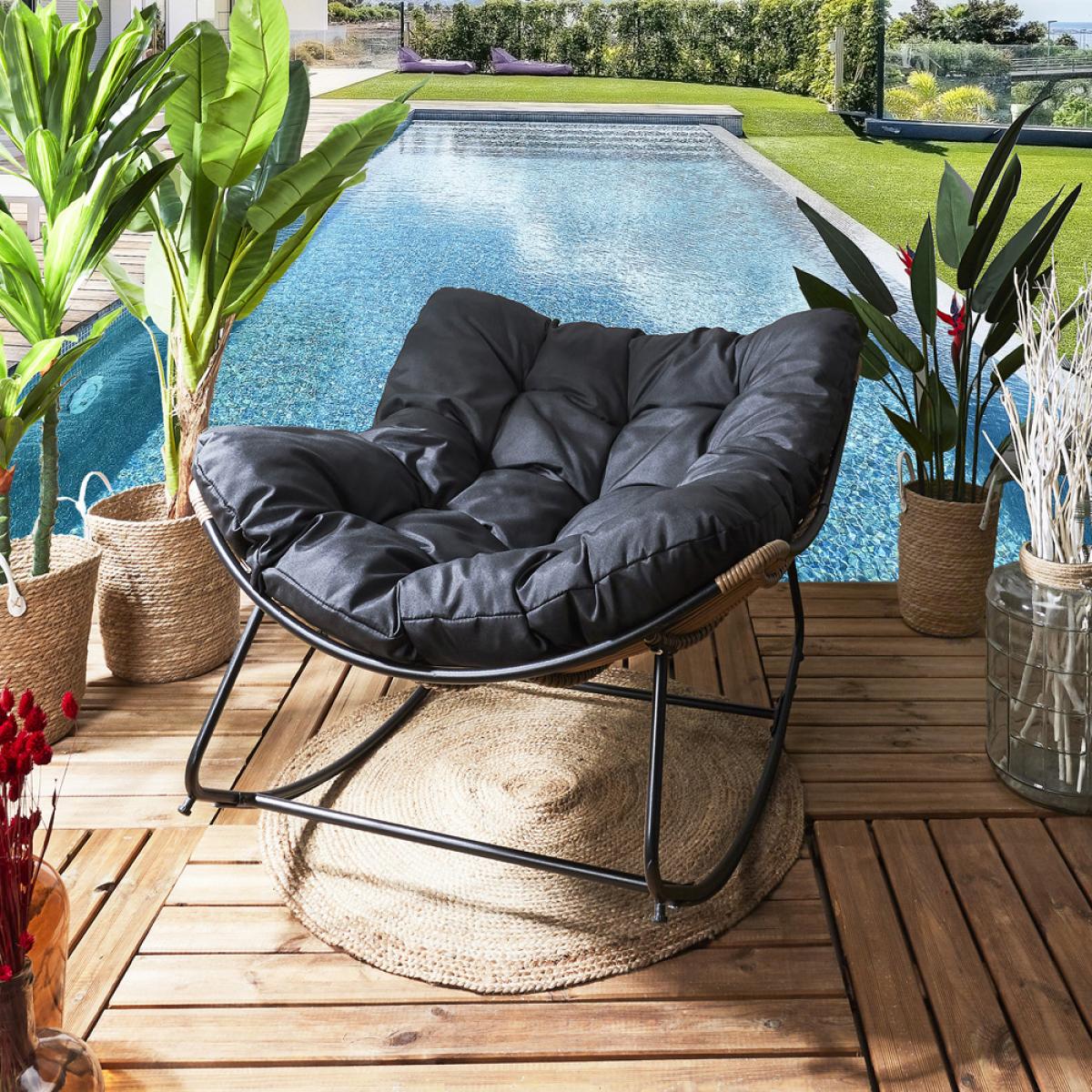 BUTACA-MECEDORA TULUM NEGRA Disfruta con tus familiares y amigos de esta original butaca-mecedora. Ideal para relajarse en el patio o el jardín. Prueba su asiento acolchado. Medidas: 96x114 cm; h.73 cm; altura del asiento: 58 cm